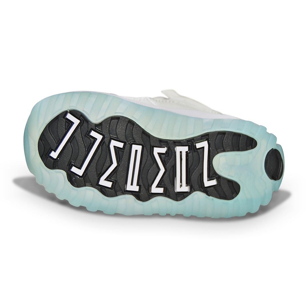 The Air Jordan 11 Retro Low TD Concord-Bred combines iconic OG colorways in a miniaturized low-top build. The white leather upper, accented with a contrasting black patent leather overlay, draws obvious parallels to the Concord Jordan 11, while the white midsole and red outsole call to mind the silhouette s Bred colorway. Underfoot, the tooling draws from the 'Bred' by combining a white foam midsole with a True Red rubber outsole.